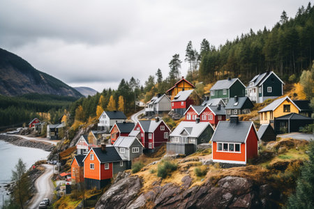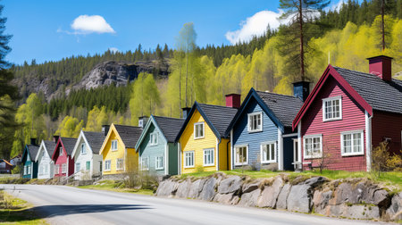 Norwegian village summer landscape with colorful houses in Norway