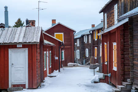 Ojeby, Sweden - April 2020: Ojeby church town outside of Pitea, Sweden. Small wooden buildings, residents to people visiting the church on Sundays.
