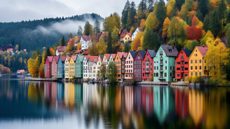 Nestled by serene waters, vibrant houses display a stunning palette of colors, while autumn foliage creates a picturesque landscape. The tranquil setting is enhanced by misty hills in the background.