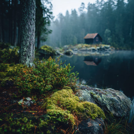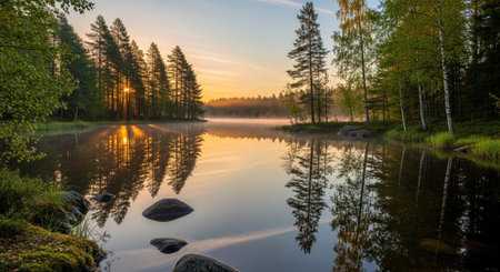 Forest reflections on the shores of quiet lakes, the tranquil beauty of the Nordic forests