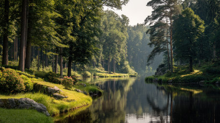 A serene landscape depicts a calm lake reflecting the surrounding trees and a clear sky. The image features a vibrant color palette, showcasing the natural beauty of the environment. Suitable for a variety of projects requiring peaceful visuals, editorial content, and commercial use.