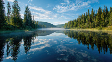 A calm lake reflects the surrounding evergreen forest on a clear day. The scene is enveloped in soft mist, creating a serene and peaceful atmosphere. The composition features lush trees and gentle lighting. Suitable for environmental or travel-related visual content.