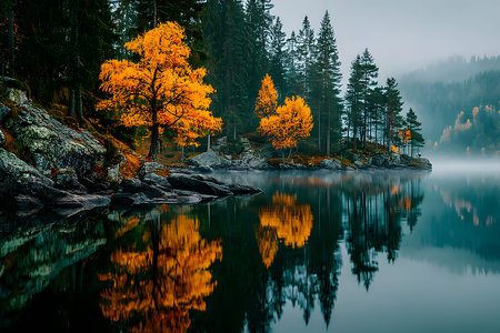 A serene lake scene features vibrant autumn trees reflecting on the still water, surrounded by a misty, dense forest. the peaceful atmosphere evokes a sense of tranquility and natural beauty, the harmonious blend of colors and textures. Generative AI
