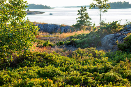 Golden sunset light baths the island flora of the Finnish archipelago, revealing the delicate textures of grasses, mosses, and low plants. The scene reflects peacefulness, ecology, natural harmony