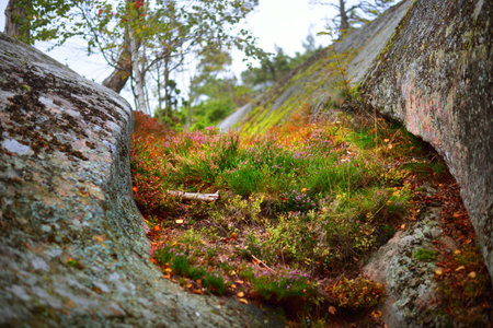 Evergreen forest near the rocky seashore of the Hanko Peninsula, Gulf of Finland. Green trees, plants, stones, moss and fern. Pure nature, ecotourism, travel destinations, environmental conservation