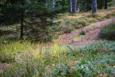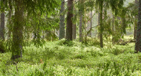 Beautiful summer view of a pine forest in Sweden, with blueberry sprigs covering the forest floor