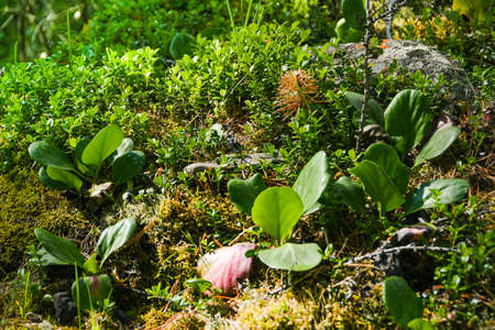 Green round leaves of Bergenia crassifolia among forest thickets. Bodan on moist moss soil. Plant is demanding of water, very shade resistant. Rhizomes are used for medicinal purposes