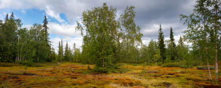 Green summer forest landscape, spruce forest trees, grass and cloudy sky Karelia