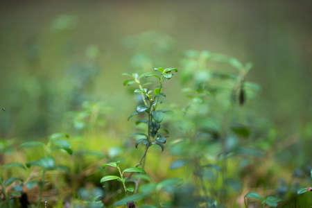 Small green forest grass with smooth leaves grows in the taiga. Unripe lingonberry plant. Wet morning. Close-up