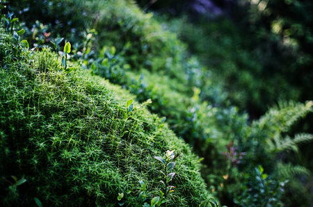 Steep mountain foot covered with green carpet, and fern sprout. Selective focus.