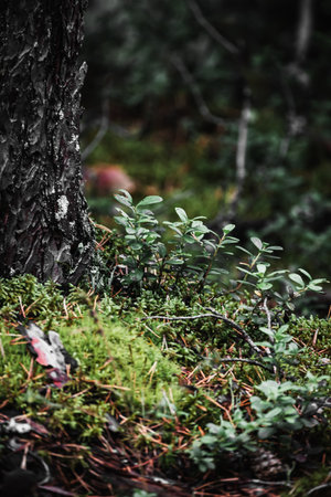 A close-up dark wide-angle view of a lingonberry (vaccinium vitis-idaea) bush in a taiga conifer woods with small lush leaves and vivid red berries with a northern moss and fir needles underlay