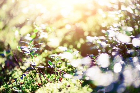 Macro of sprig of lingonberry with green leaves, growing in the Finnish forest. Nature background. Wild partridgeberry, or cowberry grows in the pine forest.