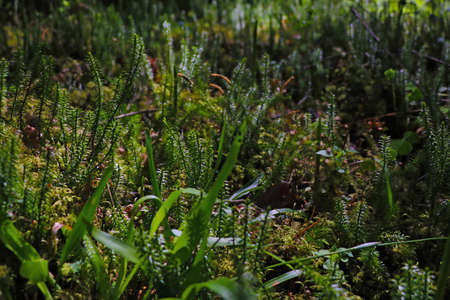 Majestic evergreen forest. Mighty pine and spruce trees, moss, fern, plants. Soft sunlight. Scandinavia. Atmospheric landscape. Pure nature, seasons, environment, eco tourism