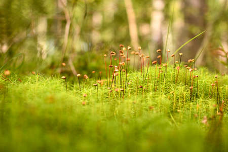 Moss bloom. Small brown pods on fine filaments rise up to spray spores. Blurred green forest background.