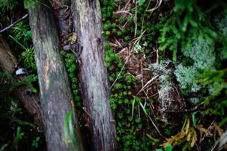Blue-gray moss on the sandy edge of a coniferous forest.