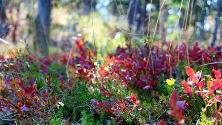 Blueberry leaves in autumn colors in Finland forest. Beautiful autumn background