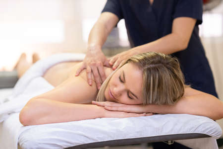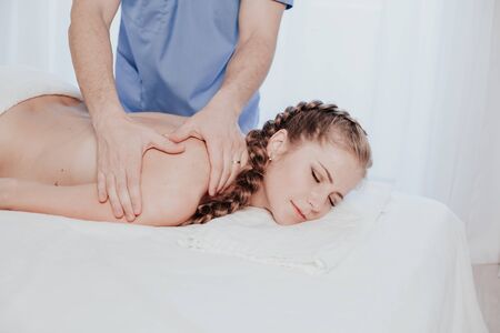 Masseur massaging back and shoulder blades of young woman lying on massage table. Concept of massage spa treatments.