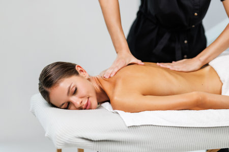 In a calming environment, a massage therapist brings relief to a client by using skilled hands on her back, enveloped in soft linens.