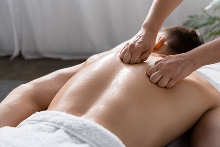 Healthcare time. Closeup on massage therapist in spa salon massaging clients back.