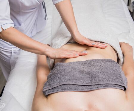 Hands of female chiropractor massaging belly of young woman lying on massage table. Concept of physical therapy treatment, neck pressure point. Part of the series. Soft focus, blurred