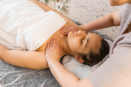 less than one masseur performing a neck massage to a beautiful woman lying down