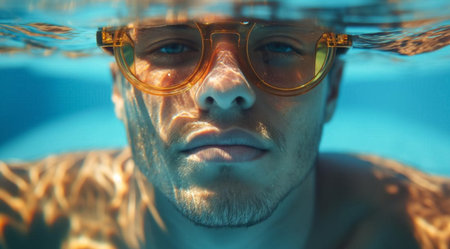 Man's face with blue eyes wearing glasses underwater close up , created with Generative AI technology