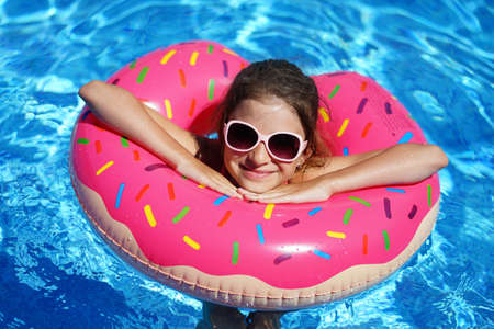 The girl swims in the pool in a pink circle. Portrait of a joyful girl on vacation at the hotel.