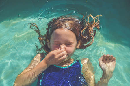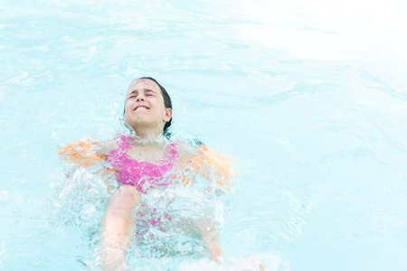 Pretty little girl in swimming pool with smile and happy in summertime.16:9 style