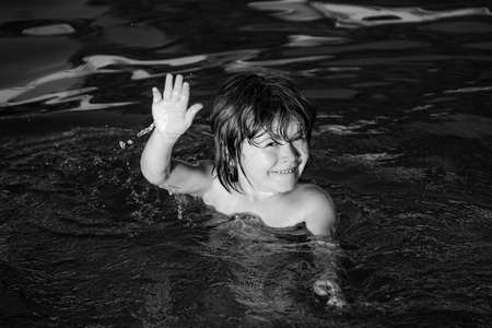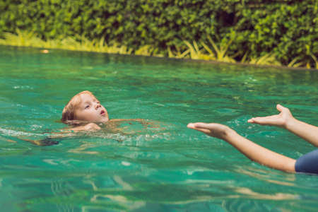 Child learning to swim in outdoor. Little kid boy at beach during summer vacation. Summer vacation and travel concept.