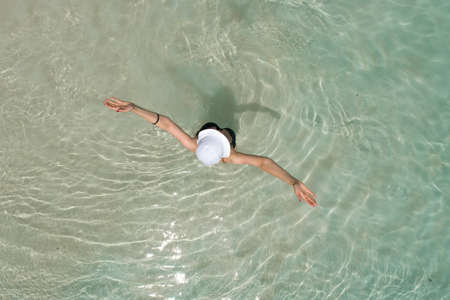 Aerial top view of woman wearing red swimsuit lying on transparent turquoise water surface on caribbean beach. Travel and vacations concept. Tropical background with copy space