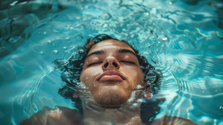 A woman floats peacefully in a bright blue swimming pool eyes closed and face serene enjoying the warmth of the sun. Water sparkles around her creating a calm atmosphere.