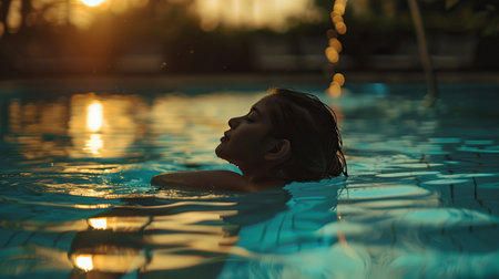 A relaxed, young man enjoying a refreshing swim in a sparkling blue pool on a hot summer day. The vibrant colors and the carefree atmosphere capture the essence of a perfect summer.