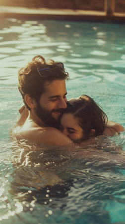 A woman and a man are swimming in a pool, enjoying a refreshing dip on a sunny day.