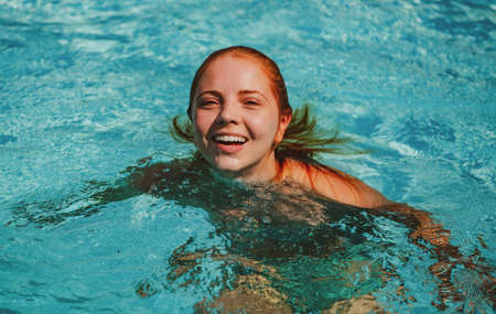 Summertime vacation. Woman in swimmingpool. . Smiling girl swimming.