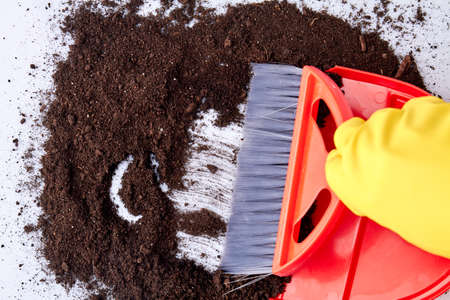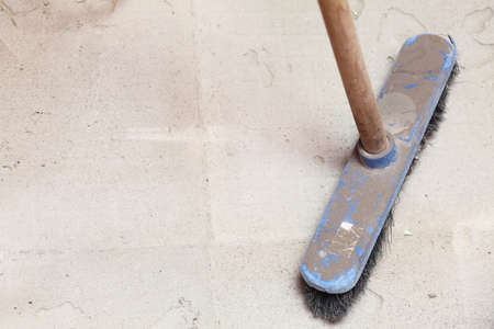 Close up view of broom sweeping floor with soil. Heap of ground on the floor close up. Cleaning service concept.