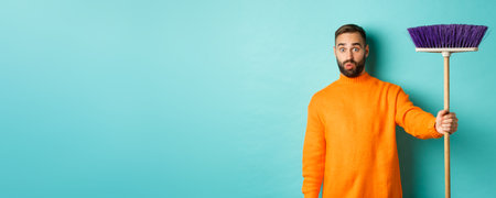 Shocked man receiving broom to do house chores, looking confused, standing over light blue background
