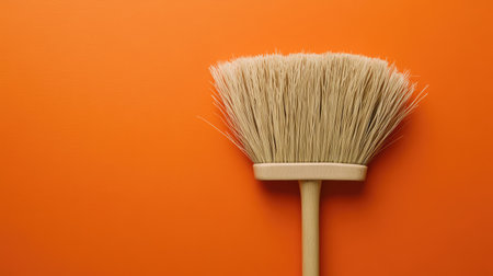 A simple natural broom with a wooden handle rests against a vibrant orange background, perfect for illustrating cleaning or home improvement themes.