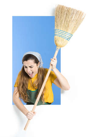 House cleaning. Broom. Bearded man with broom. Cleaning and disinfection. Professional cleaning. Cleaning service. Clean up. Clearing tools. Household. Housekeeping. Besom