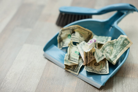 Dustpan with dollar banknotes and broom on wooden floor, closeup