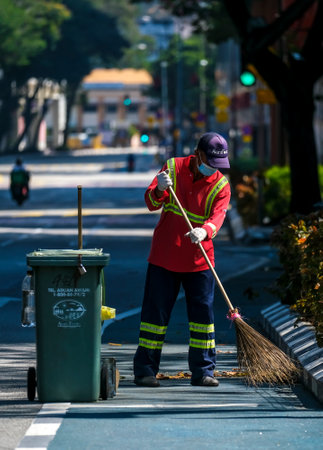 KUALA LUMPUR, MALAYSIA - APRIL 19, 2020: City cleaner worker still working during Movement Control Order (MCO) lockdown because of Coronavirus disease 2019 (COVID-19) outbreak.