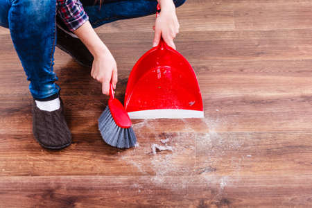 Cleanup housework concept. Closeup cleaning woman sweeping wooden floor with red small whisk broom and dustpan indoor