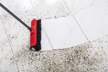High Angle View Of Broom Cleaning Dirt On Tiled Floor At Home