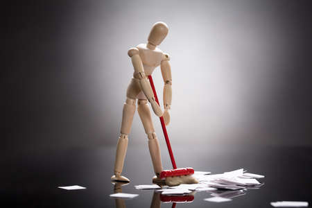 Wooden Dummy Figure Cleaning White Messy Paper On Floor