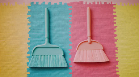 This image features vibrant sweeping tools arranged artistically against bright textured backgrounds. Perfect for promoting cleanliness, organization, and stylish home care.