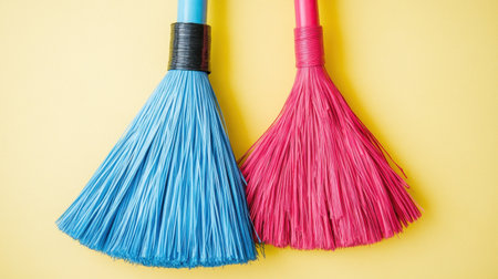 Bright and colorful brooms in blue and pink stand against a yellow background, showcasing vibrant colors ideal for cleaning and domestic care imagery.