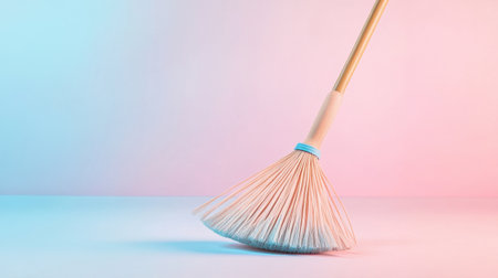 A minimalistic broom stands against a pastel gradient background, capturing the essence of cleanliness and simplicity in modern home decor. Ideal for lifestyle themes.