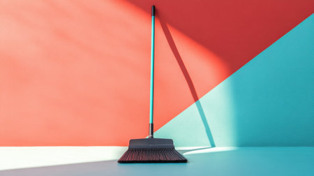 A minimalist image showcasing a broom with a vibrant peach and aqua background, highlighting modern cleaning tools and their place in home decor.