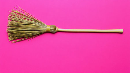 This image features a natural straw broom against a bright pink background, showcasing its rustic charm and utility in both cleaning and decorative contexts.