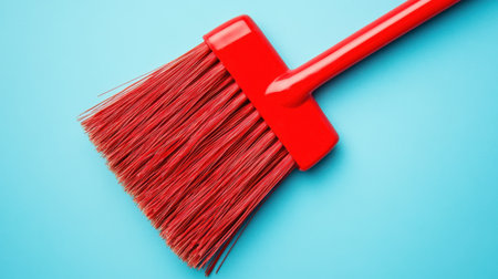 A close-up image of a vibrant red paint brush resting on a light blue background. Ideal for artistic themes, home improvement, and creative projects.
