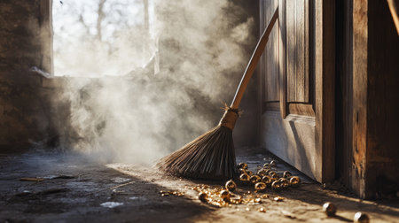 An evocative scene featuring a broom resting beside a door, surrounded by golden beads on the dusty floor. Sunlight shines through, creating a mystical atmosphere.